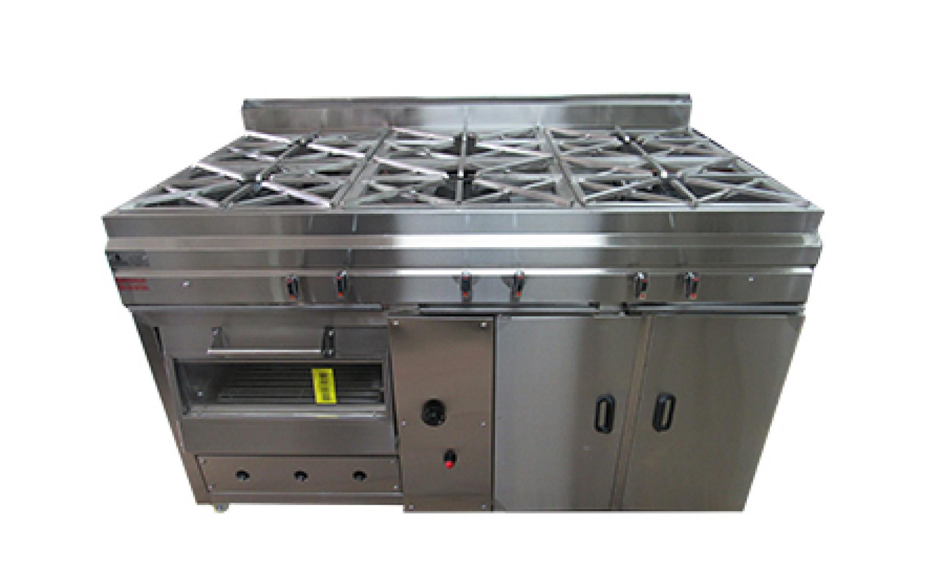 Especial para alta cocina. Posee seis fogones de alto rendimiento con quemadores en hierro fundido indeformables, horno gratinador en parte inferior con quemadores tubulares y operación por medio de termostato. Gabinente a un costado para guardar utensilios.